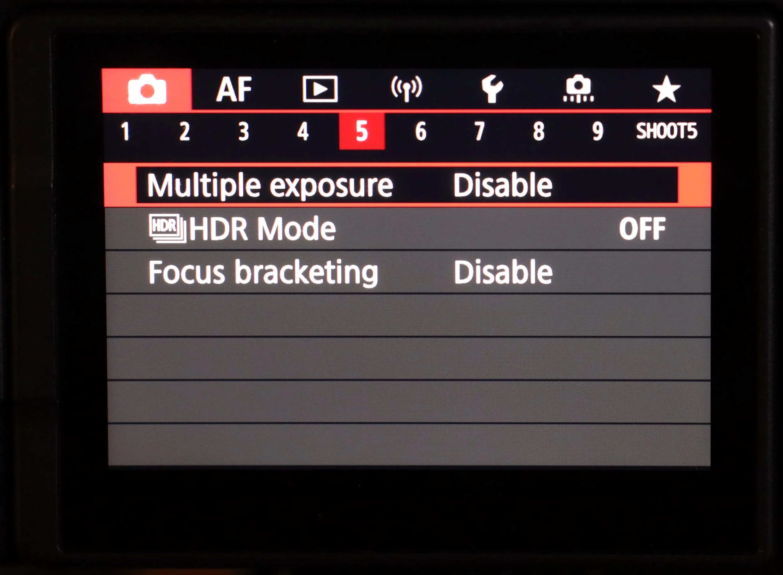 As a reminder, not all Canon cameras have the multiple exposure feature and there my be some variations on this feature from camera to camera. In general, the multiple exposure feature can be found in the red, shoot menu. For example, it is found on page 5 of the shoot menu on the Canon EOS R and R6.